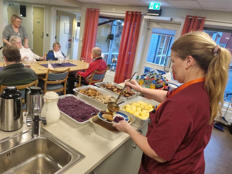 Tine Bjørnbeth legger opp maten mens beboerne kommer til bordet. - Det er veldig kjekt for oss å få maten slik. Dette setter vi pris på alle sammen.